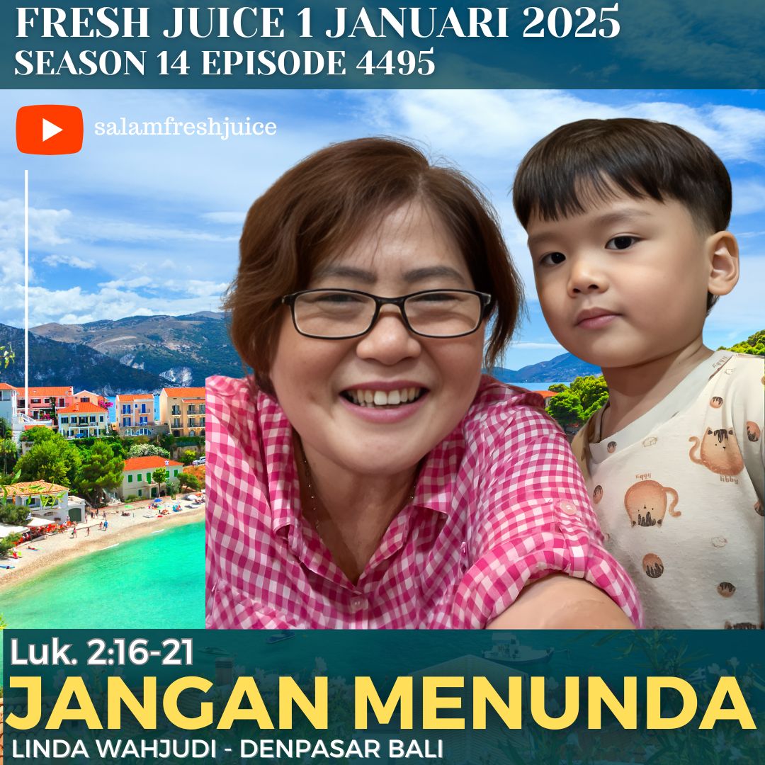 You are here: Home › Uncategorized › Fresh Juice 1 Januari 2026 – Luk. 2:16-2 : Jangan Menunda ← Fresh Juice 31 Desember 2025 – Yoh 1:1-18 : Dari manusia biasa menjadi anak-anak Allah! Fresh Juice 2 Januari 2026 – Yoh. 1:19-28 : Happy, Inspiratif dan sejahtera → Fresh Juice 1 Januari 2026 – Luk. 2:16-2 : Jangan Menunda Podcast: Play in new window | Download (0.0KB) Pembawa Renungan : Linda Wahjudi Denpasar Bali Luk. 2:16-21
