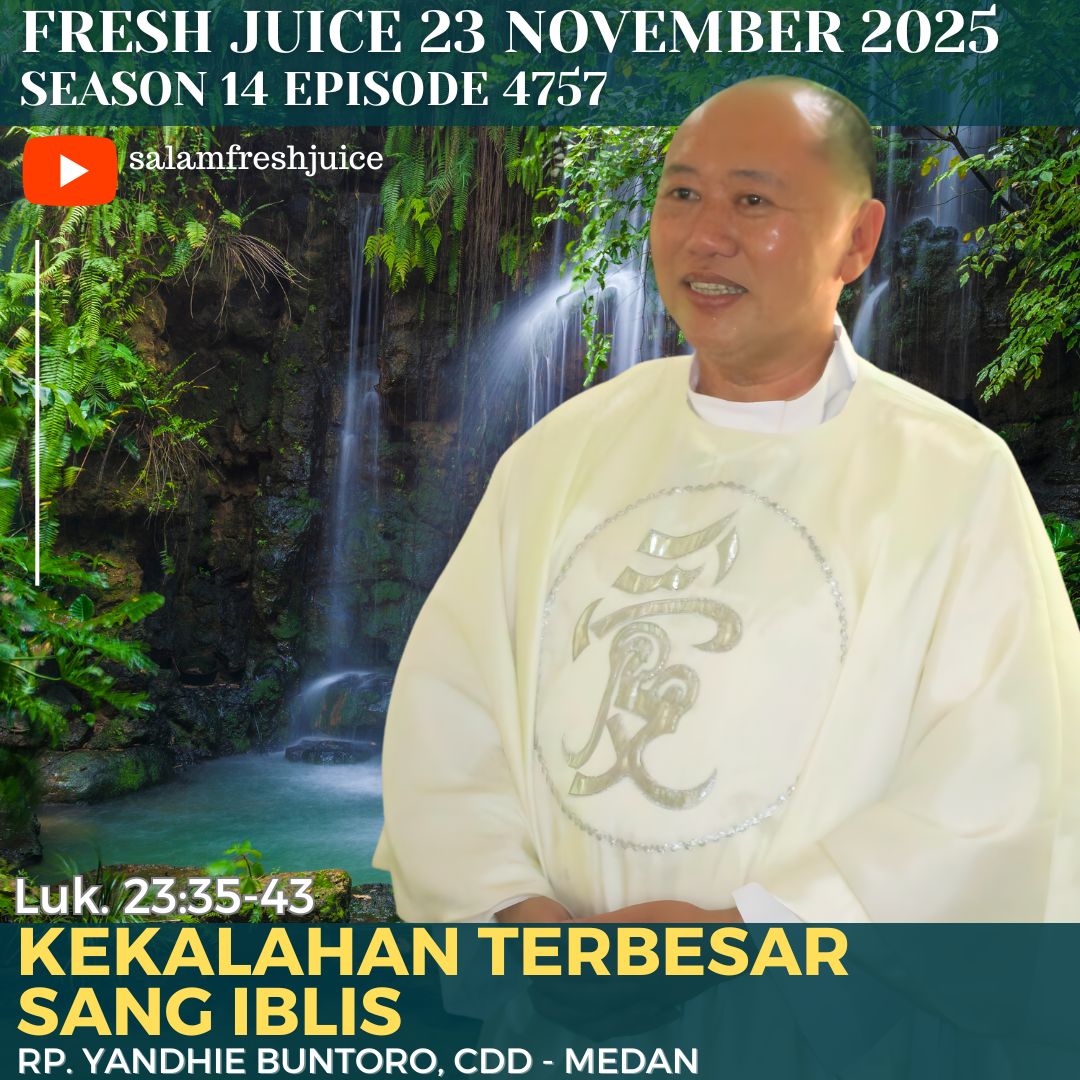 You are here: Home › Uncategorized › Fresh Juice 23 November 2025 – Luk. 23:35-43 : Kekalahan Terbesar Sang Iblis ← Fresh Juice oleh OMK 22 November 2025 – Lukas 20: 27-40 : Lebih dari Sekedar Romansa Fresh Juice 24 November 2025 – Luk. 21:1-4 : Biarkan Orang Lain Tahu Kamu Banyak Kekurangan hihihihi → Fresh Juice 23 November 2025 – Luk. 23:35-43 : Kekalahan Terbesar Sang Iblis Podcast: Play in new window | Download (0.0KB) Pembawa Renungan : RP. Yandhie Buntoro, CDD Medan Luk. 23:35-43.