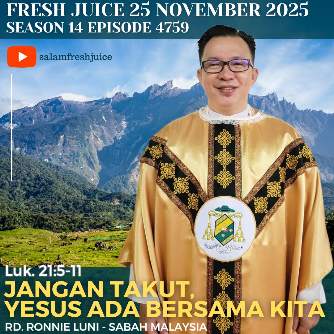 You are here: Home › Uncategorized › Fresh Juice 25 November 2025 – Luk. 21:5-1 : Jangan takut, Yesus ada bersama kita ← Fresh Juice 24 November 2025 – Luk. 21:1-4 : Biarkan Orang Lain Tahu Kamu Banyak Kekurangan hihihihi Fresh Juice 26 November 2025 – Luk. 21:12-19 : Bertahanlah, Tuhan gak mungkin bohong → Fresh Juice 25 November 2025 – Luk. 21:5-1 : Jangan takut, Yesus ada bersama kita Podcast: Play in new window | Download (0.0KB) Pembawa Renungan : RD. Ronnie Luni Sabah – Malaysia Luk. 21:5-11